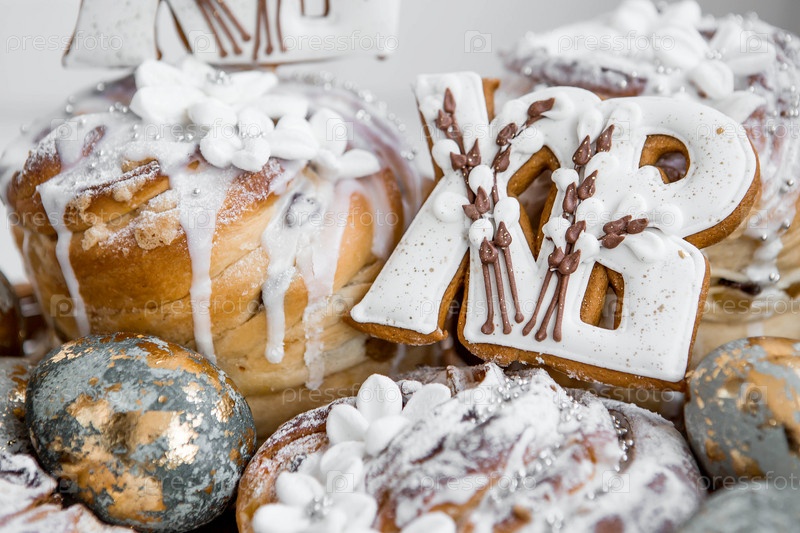 Пасхальные яйца с золотом, куличи и перники в форме букв XB в плетеной корзине из винограда