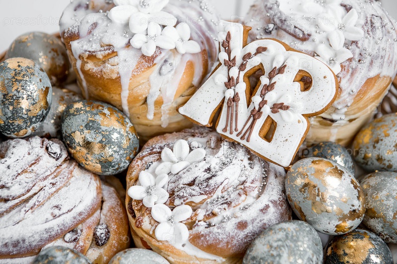 Пасхальные яйца с золотом, куличи и перники в форме букв XB в плетеной корзине из винограда