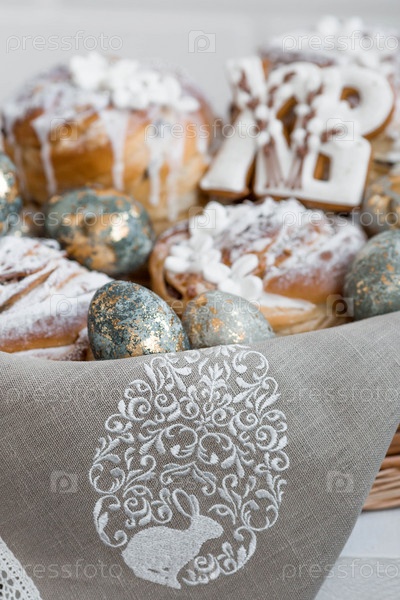 Пасхальные яйца с золотом, куличи и перники в форме букв XB в плетеной корзине из винограда