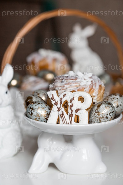 Пасхальные яйца с золотом, куличи и перники в форме букв XB в плетеной корзине из винограда
