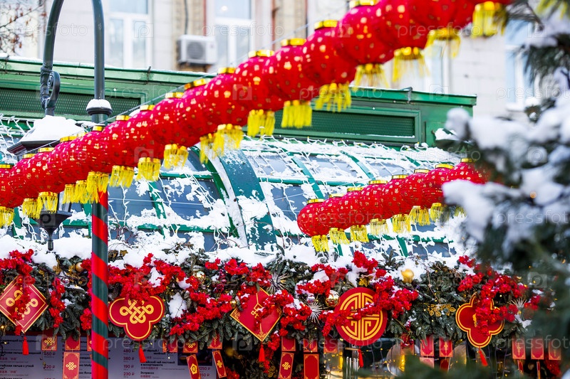 Китайские красные рождественские фонарики на Тверской улице в Москве. Крупный план. Первая в истории встреча китайского Нового года 2024 в Москве