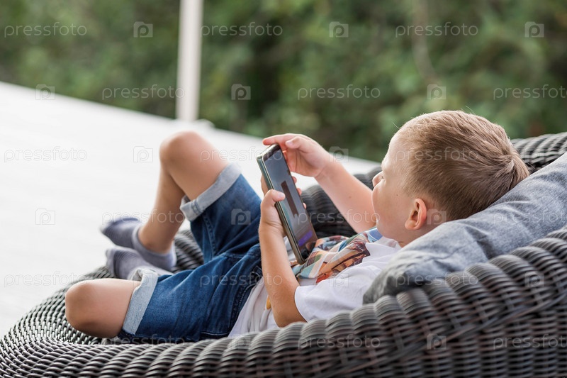 5-летний мальчик со смартфоном в руках на веранде. Ребенок играет в телефон. Вред гаджетов для детей. Защитите ребенка от смартфона. Дети и гаджеты