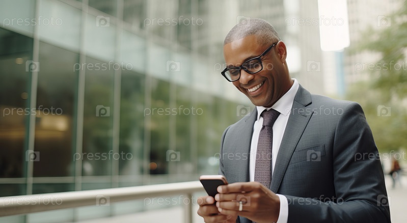 Крупный план афроамериканского бизнесмена в строгом костюме со смартфоном на фоне улицы делового района города. Онлайн-мониторинг биржевых отчетов