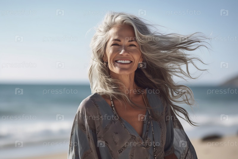 Портрет улыбающейся женщины, закутанной в одеяло на пляже