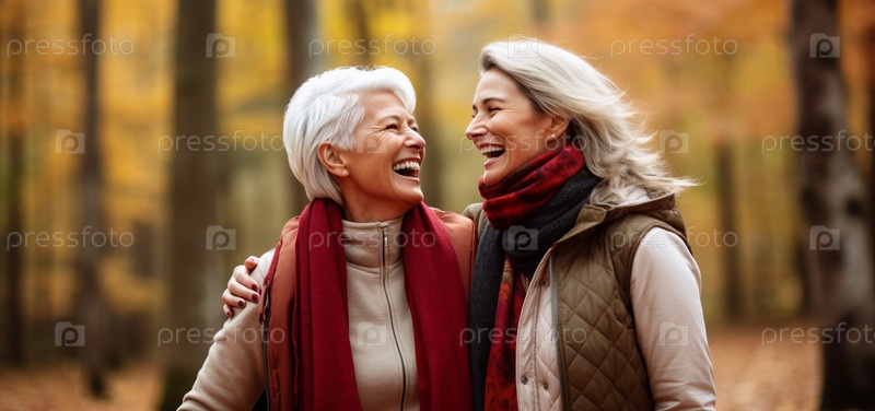 Две пожилые подруги отправляются в поход по лесу осенью
