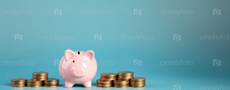 Розовая свинья-копилка рядом со стопкой золотых монет, изолированная на синем фоне