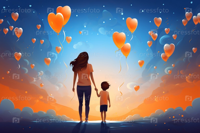 Два силуэта держатся за руки, ребенок маленький и одет в красную рубашку, а взрослый в черную футболку стоит на вершине холма с воздушным шаром в форме сердца в форме дерева, парящим в небе, полным светящихся сердец, летающих вокруг них, романтическая сце