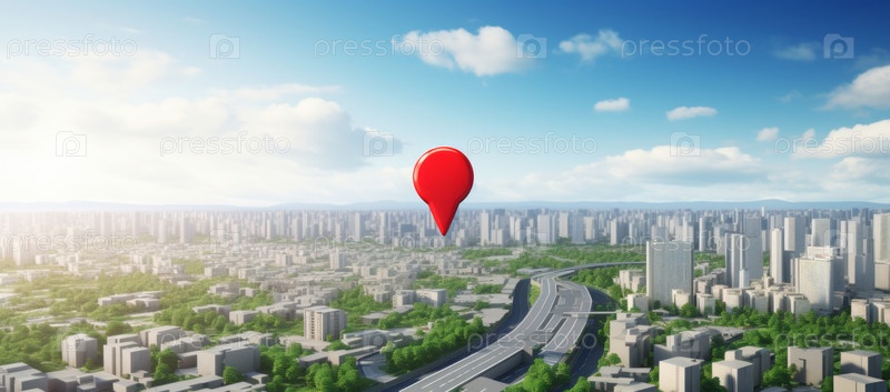 Концепция сетевого подключения. Вид с воздуха на город с булавкой местоположения
