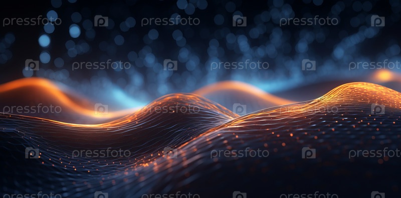Абстрактные синие и желтые волны на темном фоне и огни боке