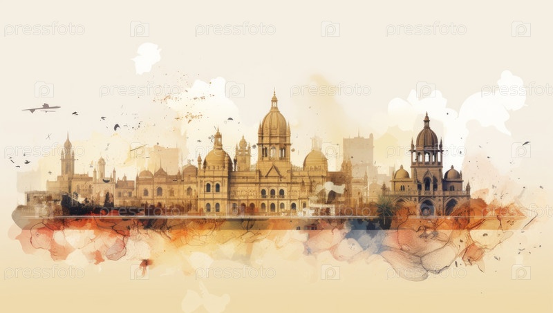 Акварельный всплеск с нарисованным от руки эскизом Ворот Индии Мумбаи, Индия на иллюстрации