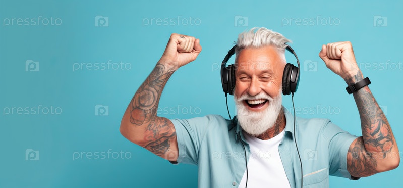 Радостный пожилой мужчина слушает музыку в наушниках