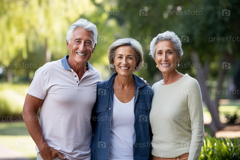 Пожилые родители на природе со своей взрослой дочерью сидят, разговаривают и сближаются в саду. Счастливые, любящие и пожилые люди обнимают ребенка с заботой, счастьем и привязанностью в открытом парке