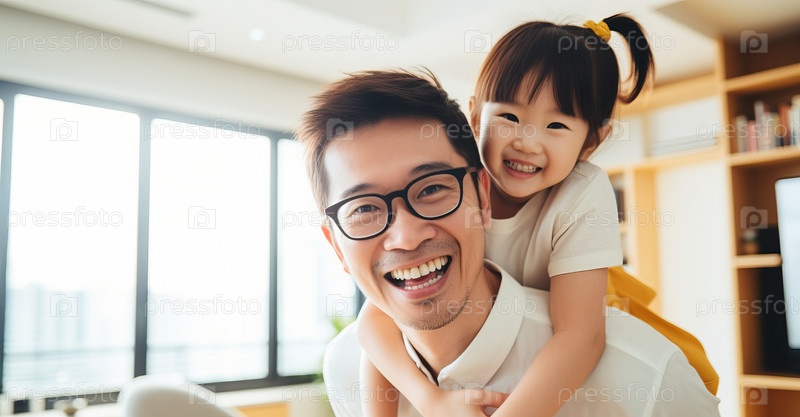 Веселый папа, несущийся на шее, играет со счастливой маленькой дочерью-дошкольницей в помещении. Игривая маленькая девочка веселится с улыбающимся бородатым отцом дома, концепция хороших семейных отношений