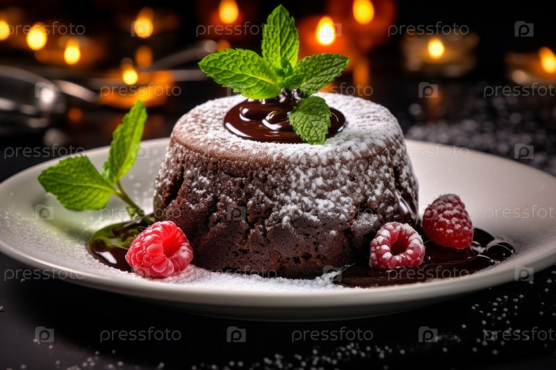 Роскошный расплавленный торт, украшенный малиновой и шоколадной помадкой, подается на блюде