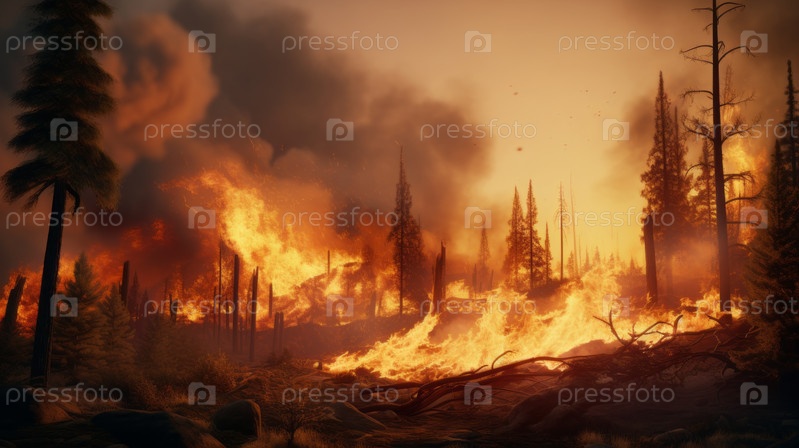 Пожар охватывает лес и сухую траву, оставляя на земле черный слой гари и пепла