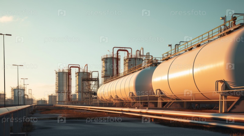 Резервуары для хранения нефти и газа. Рядом расположены промышленные сооружения и гигантские резервуары