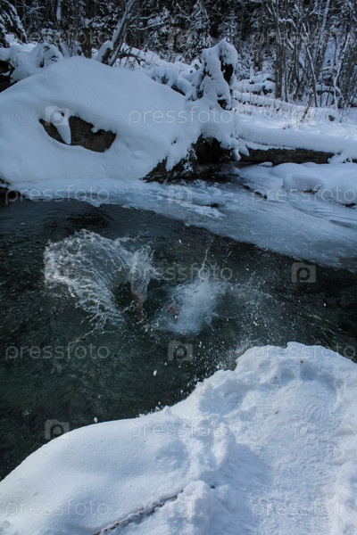 Брызги после ныряния в зимнюю горную реку. Берега покрыты льдом и снегом
