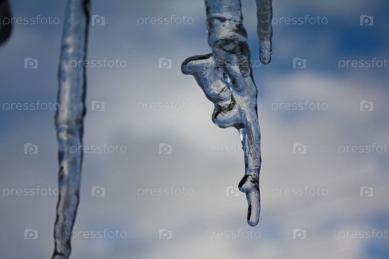 Прозрачная фигурная сосулька крупным планом с размытым бело-голубым фоном