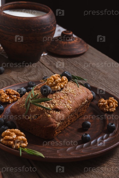 Шоколадный кекс с грецкими орехами и черникой на глиняной тарелке. Подача блюд в деревенском стиле
