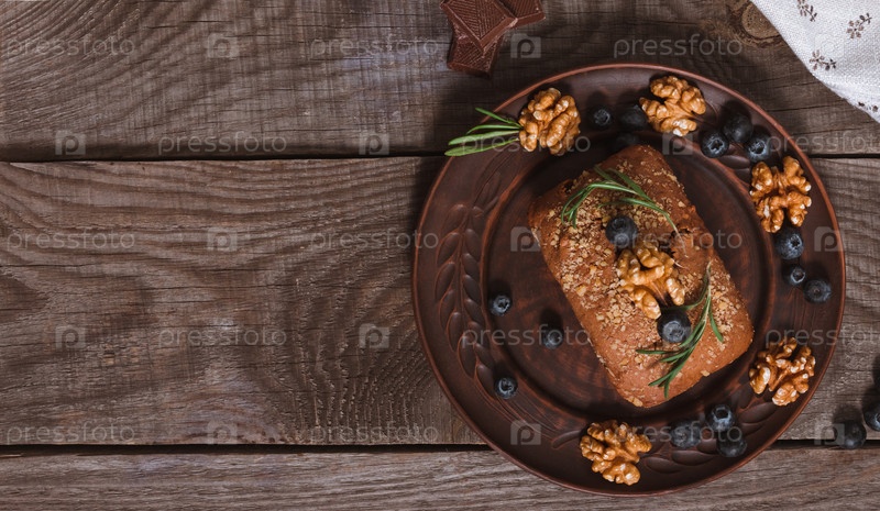 Шоколадный кекс с орехами, украшенный черникой и розмарином, на деревенской глиняной тарелке, вид сверху