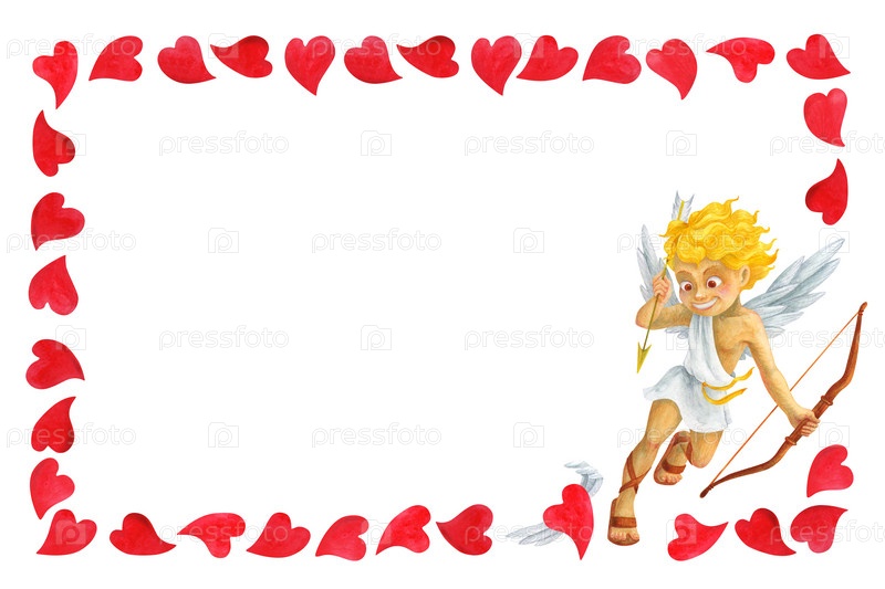 Простая рамка из красных сердечек с персонажем Херувим, стреляющим стрелой из лука. акварель романтический фон с местом для текста. прямоугольная горизонтальная рама для открытки, плаката. Simple red hearts frame with Cherub character shooting an arrow