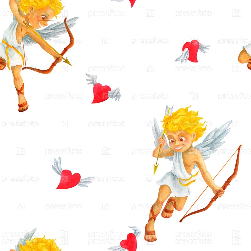 Бесшовный рисунок с херувимом или Купидоном, охотящимся на красные летающие сердца. Романтический акварельный орнамент с символами любви и брака для оберточной бумаги, текстиля, обоев к Дню святого Валентина. Seamless pattern with cartoon Cherub Cupid hun