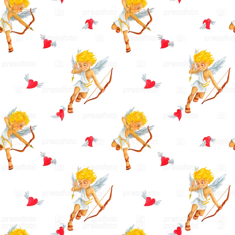 Бесшовный рисунок с херувимом или Купидоном, охотящимся на красные летающие сердца. Романтический акварельный орнамент с символами любви и брака для оберточной бумаги, текстиля, обоев к Дню святого Валентина. Seamless pattern with cartoon Cherub Cupid hun