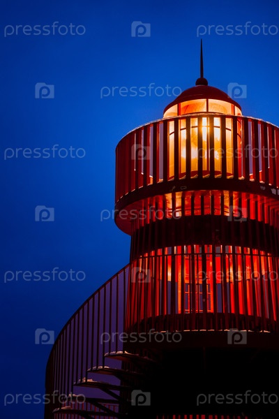 Солнечногорск, Россия – 5 января, 2025 год. Десятиметровый красный маяк на набережной озера Сенеж. Ярко-красное сооружение с винтовой лестницей. Свет в ночи