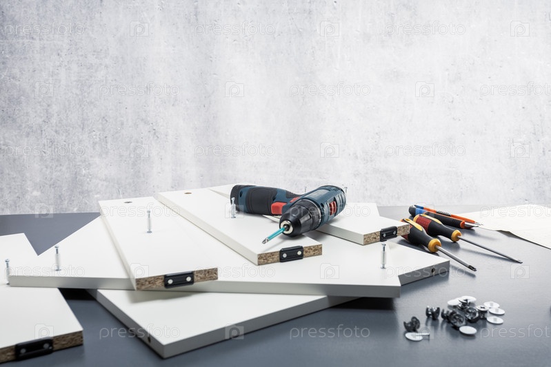Концепция услуги по сборке мебели. Различные инструменты и детали мебели на столе. Место для текста
