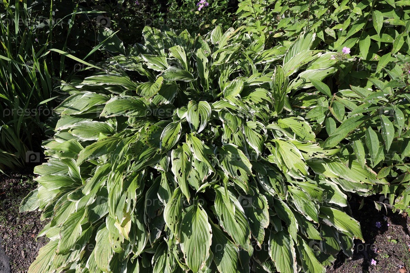 Большой куст хосты, листья которого повреждены гусеницами