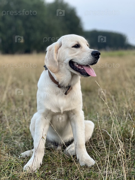 Собака породы золотистый ретривер сидит в поле на фоне леса