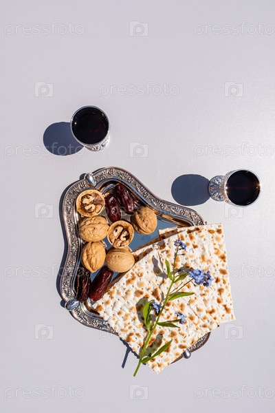 Маца на серебряном подносе с орехами, финики на светлом фоне. бокалы с красным вином. Традиционное угощение на праздник Песах. вид сверху