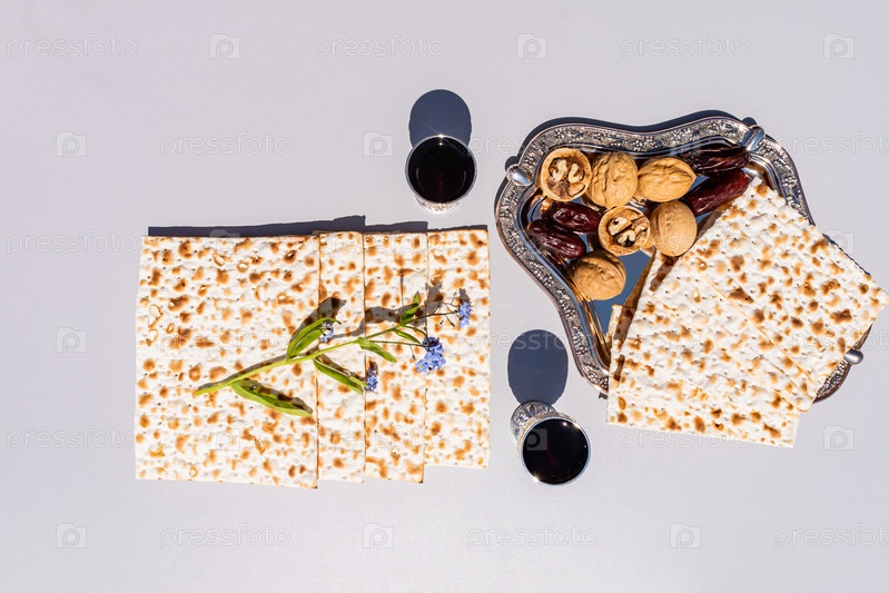 Традиционный пасхальный хлеб маца и серебряные бокалы красного вина на сером фоне. грецкие орехи, финики. Концепция праздника Песах. вид сверху