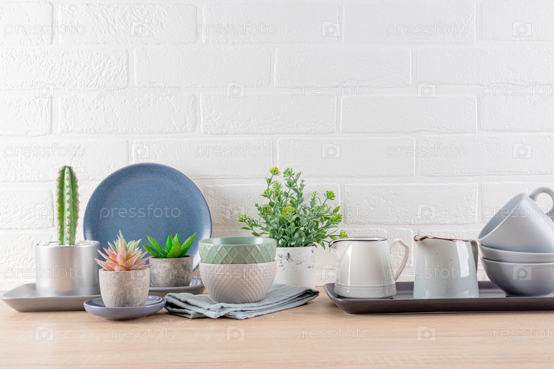 Стильный кухонный фон в серых тонах. Набор керамической посуды, комнатные растения на деревянной столешнице. Вид спереди. космическая копия. Белая кирпичная стена