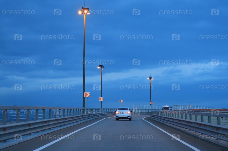 Белый автомобиль движется по трассе. Габариты, фонарные столбы. СОЧИ, Июль 2024