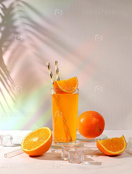 Апельсиновый сок и апельсины на солнечном кухонном столе с длинными жесткими тенями. Современный натюрморт с цитрусовыми, концепция минимальной детокс-диеты, летние витаминные напитки, селективный фокус,