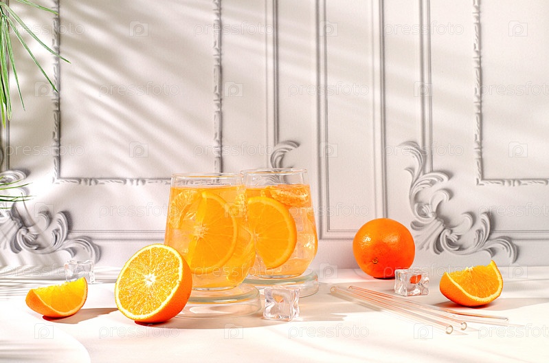 Современный натюрморт с цитрусовыми, апельсиновым соком и апельсинами на элегантном кухонном столе с длинными жесткими тенями, концепция минимальной детокс-диеты, летние витаминные напитки, селективный фокус,