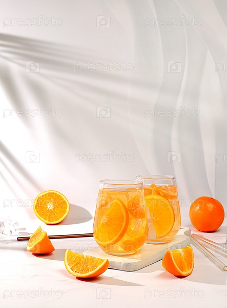 Апельсиновый сок и апельсины на элегантном кухонном столе с длинными жесткими тенями. Современный натюрморт с цитрусовыми, концепция минимальной детокс-диеты, летние витаминные напитки, селективный фокус,