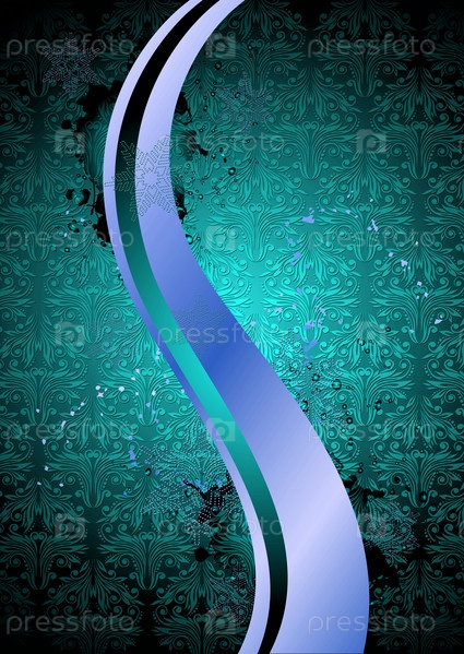 Рождественский фон в сине-голубых тонах с закрученными лентами, нежными снежинками и декоративным цветочным узором в стиле дамаск создает праздничный и элегантный праздничный дизайн