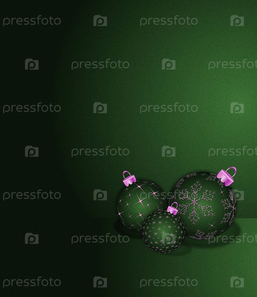 Зеленые елочные шары с розовыми украшениями, лежащие на зеленом фактурном фоне, создают праздничную атмосферу