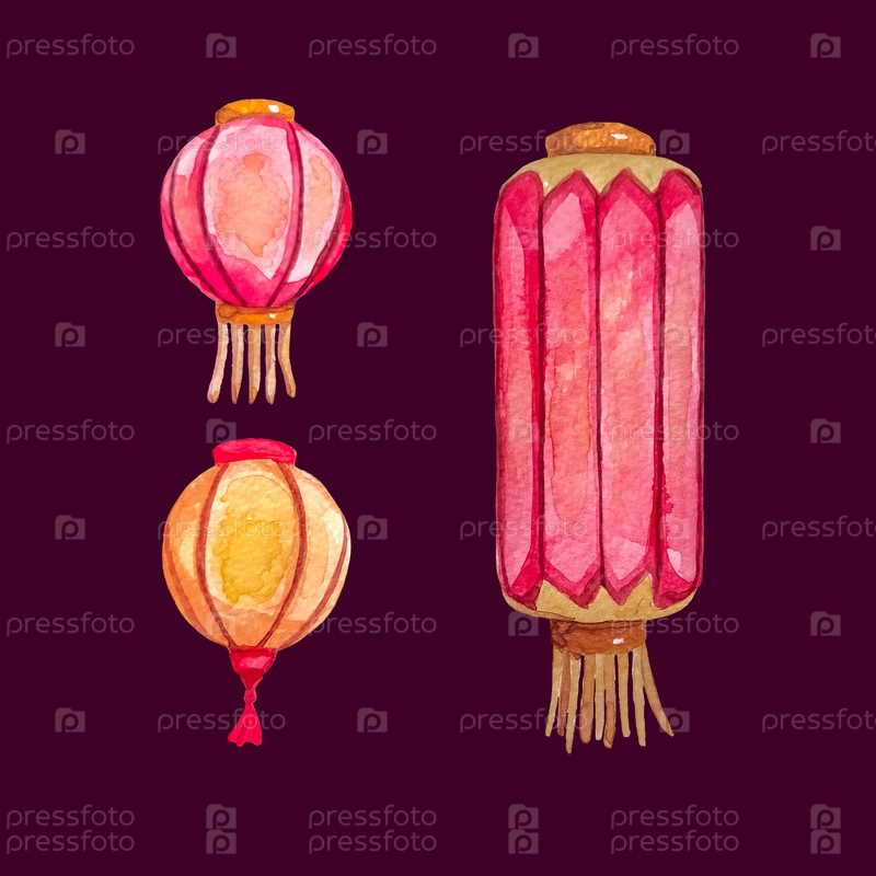 Акварельные китайские фонарики набор. Нарисованная вручную иллюстрация изолирована на темном фоне