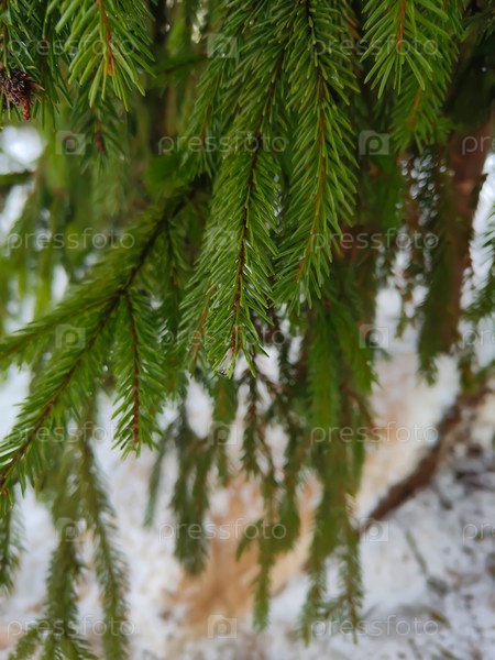 Еловые ветки в снегу, крупный план. Зимний фон