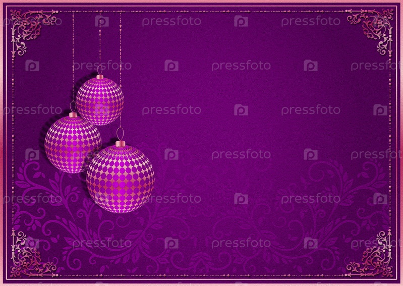 Фиолетовый рождественский фон с подвесными украшениями, цветочным узором и декоративной каймой, создающий праздничную и элегантную праздничную атмосферу