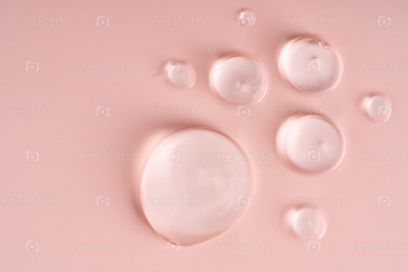 Крупный план полупрозрачных капель геля на нежно-розовой поверхности, подчеркивающих прекрасные текстуры средств по уходу за кожей
