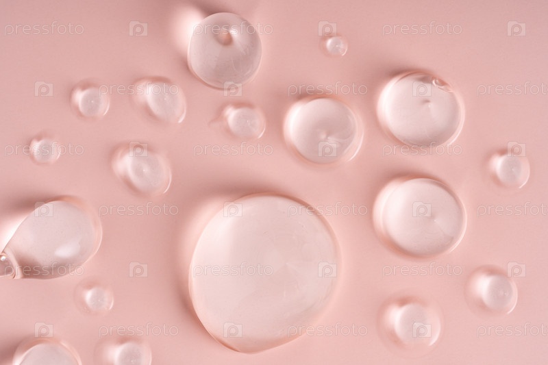 Крупный план полупрозрачных капель геля на нежно-розовой поверхности, подчеркивающих прекрасные текстуры средств по уходу за кожей