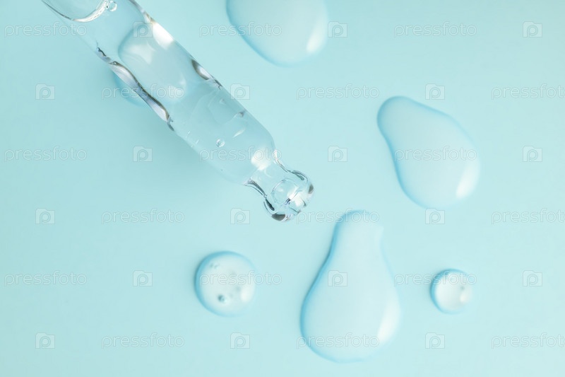 Элегантная и красивая пипетка для сыворотки с блестящими каплями, расположенными на мягкой голубой поверхности