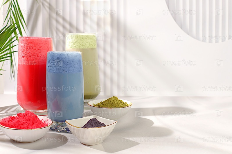 Ассортимент различных видов матча-чая латте с молоком на элегантном кухонном солнечном фоне и матча-порошок. Традиционный индийский напиток, богатый антиоксидантами, используется для похудения и лечения