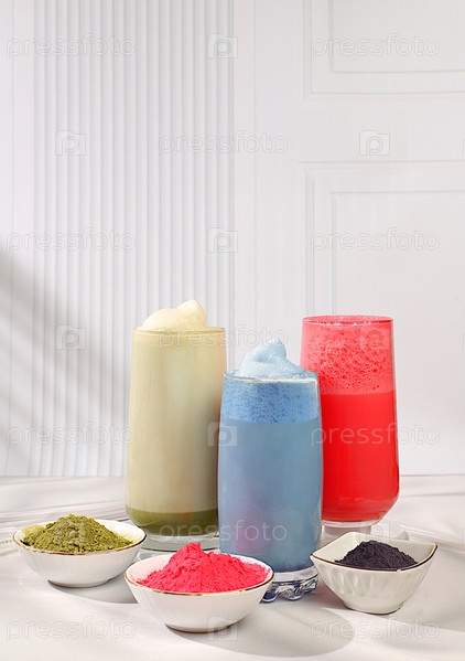 Ассортимент различных матча чай латте с молоком на элегантной кухне солнечный фон и матча порошок. Традиционный индийский напиток богат антиоксидантами, используется для похудения и лечения, селективный фокус
