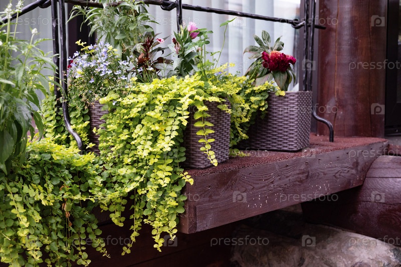 Красивый ландшафтный сад с каменным фасадом и яркой зеленью