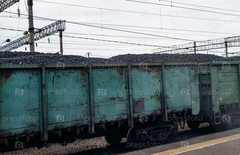 Вагон грузового поезда, груженный углем, на железнодорожной станции